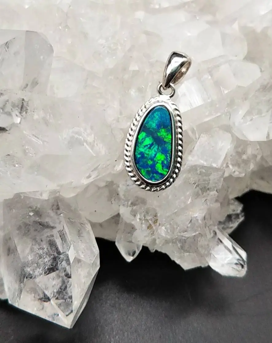 遊色効果といわれるキラキラとエメラルドグリーンと青色に輝く様は胸元で美しく輝くでしょう