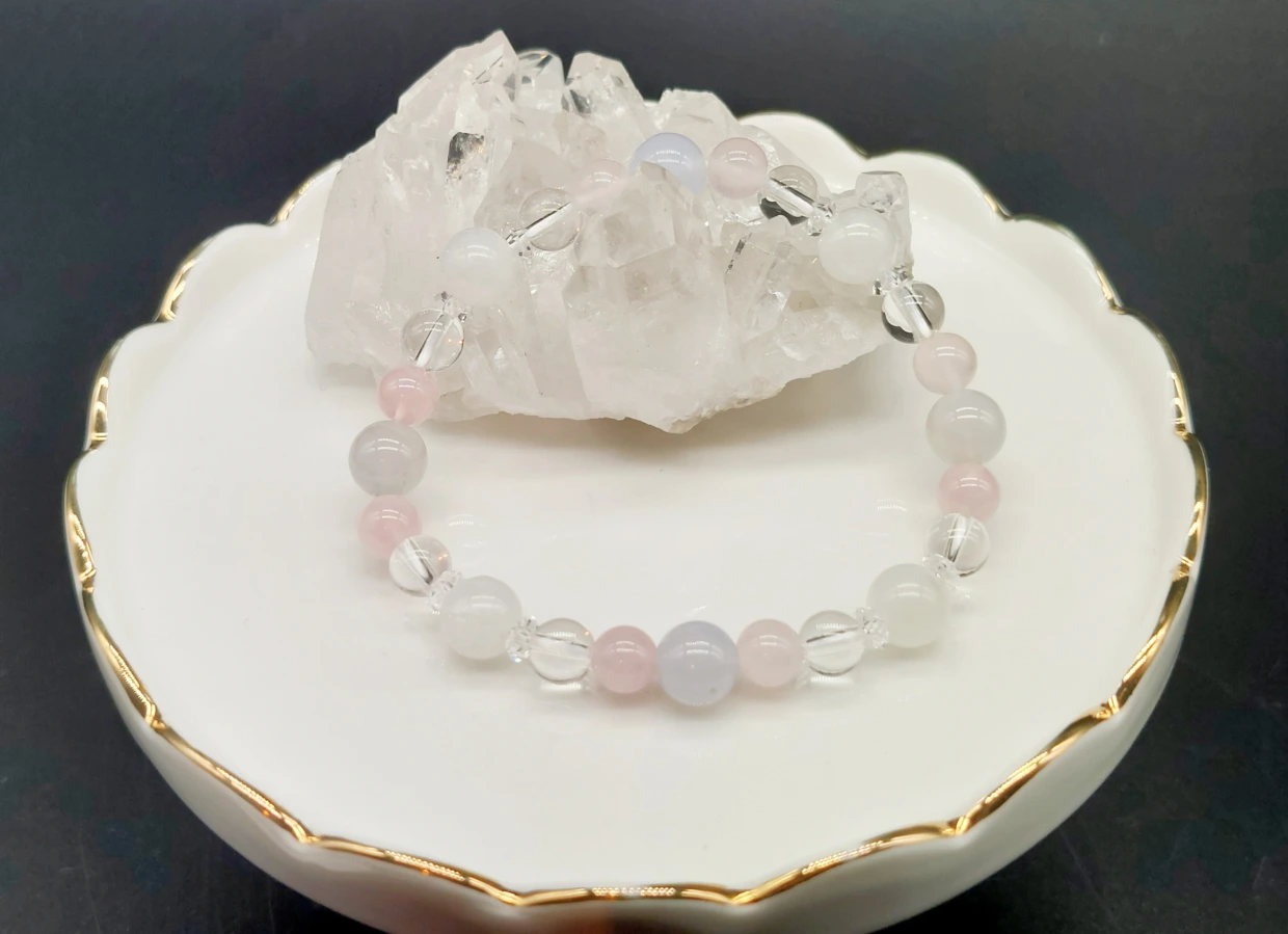 この癒しブレスはムーンストーン、ローズクォーツ、ブルーレースアゲート、水晶が調和し、冷静でありながらも可愛らしさを引き立てるブレスレットです。