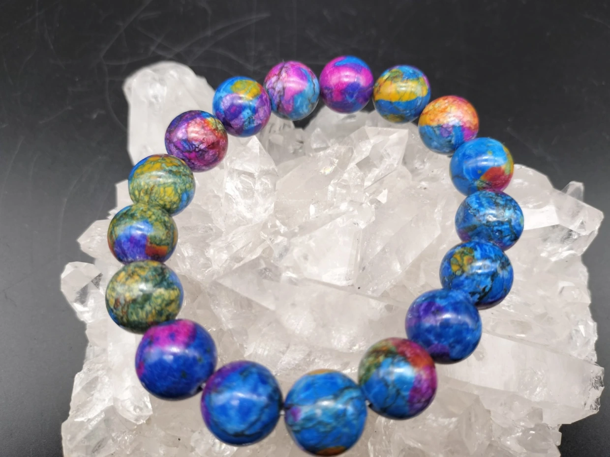 ボーナイトの力強いエネルギーを感じさせるブレスレットです。ボーナイトは鮮やかな赤色や青色を持つ鉱石で、その色合いが特徴的です。このブレスレットは、ボーナイトの自己表現と活力に満ちたエネルギーを身にまとうことができます。