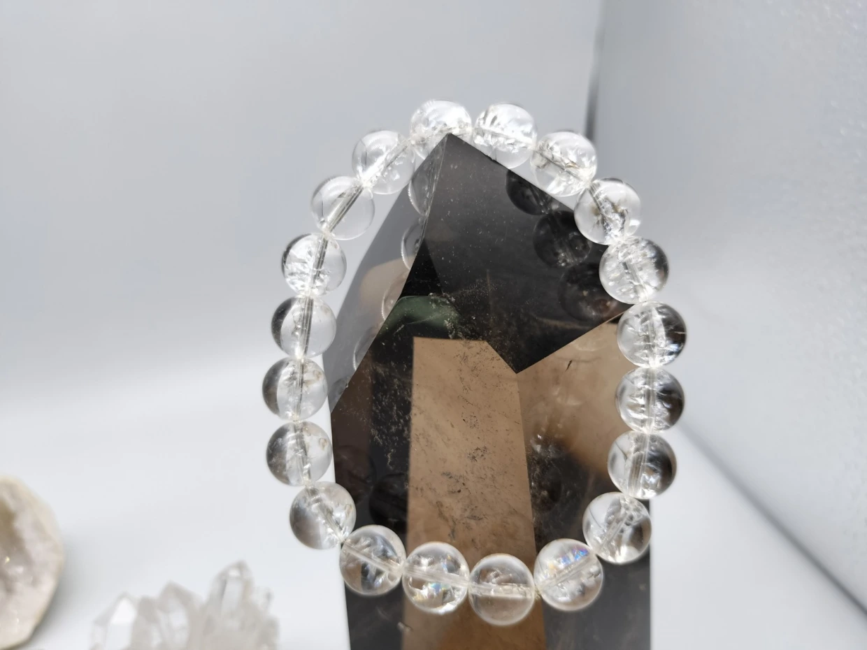 神秘的な虹色の輝きを放つアイリスクォーツ(チベット産)を用いたブレスレットです。クラック(ひび割れ)が光を反射して生まれる虹色は、見る角度によって異なる表情を見せ、飽きることなく楽しめます。